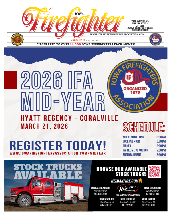 The Iowa Firefighter View the latest issue of the Iowa Firefighter below. 2026 Issues of the Iowa Firefighter January 2026 Click Here to View February 2026 Click Here to View March 2026 Click Here to View April 2026 Coming Soon.. May 2026 Coming Soon.. June 2026 Coming Soon.. July 2026 Coming Soon.. August 2026 Coming Soon.. September 2026 Coming Soon.. October 2026 Coming Soon.. November 2026 Coming Soon.. December 2026 Coming Soon.. 2026 JanuaryFebruary 2025 JanuaryFebruaryMarchAprilMayJuneJulyAugustSeptemberOctoberNovemberDecember 2024 JanuaryFebruaryMarchAprilMayJuneJulyAugustSeptemberOctoberNovemberDecember 2023 JanuaryFebruaryMarchAprilMayJuneJulyAugustSeptemberOctoberNovemberDecember 2022 JanuaryFebruaryMarchAprilMayJuneJulyAugustSeptemberOctoberNovemberDecember 2021 JanuaryFebruaryMarchAprilMayJuneJulyAugustSeptemberOctoberNovemberDecember 2020 JanuaryFebruaryMarchAprilMayJuneJulyAugustSeptemberOctoberNovemberDecember 2019 JanuaryFebruaryMarchAprilMayJuneJulyAugustSeptemberOctoberNovemberDecember 2018 JanuaryFebruaryMarchAprilMayJuneJulyAugustSeptemberOctoberNovemberDecember 2017 JanuaryFebruaryMarchAprilMayJuneJulyAugustSeptemberOctoberNovemberDecember 2016 JanuaryFebruaryMarchAprilMayJuneJulyAugustSeptemberOctoberNovemberDecember 2015 JanuaryFebruaryMarchAprilMayJuneJulyAugustSeptemberOctoberNovemberDecember 2014 JanuaryFebruaryMarchAprilMayJuneJulyAugustSeptemberOctoberNovemberDecember 2013 JanuaryFebruaryMarchAprilMayJuneJulyAugustSeptemberOctoberNovemberDecember 2012 JuneJulyAugustSeptemberOctoberNovemberDecember